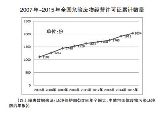 環(huán)境保護(hù)部近日公布的《2016年全國(guó)大、中城市固體廢物污染環(huán)境防治年報(bào)》(以下簡(jiǎn)稱(chēng)《2016年報(bào)》)顯示,全國(guó)危險(xiǎn)廢物處理能力明顯提高,截至2015年底,各省(區(qū)、市)累計(jì)頒發(fā)的危險(xiǎn)廢物(含醫(yī)療廢物)經(jīng)營(yíng)許可證共2034份,比2014年增加113份,全國(guó)危險(xiǎn)廢物經(jīng)營(yíng)單位核準(zhǔn)危廢處理能力達(dá)5263萬(wàn)噸/年,較同期提高959萬(wàn)噸/年。
