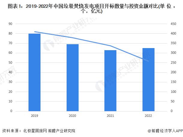 垃圾焚燒發(fā)電行業(yè)在歷經(jīng)“跑馬圈地”、“搶裝潮”等時期后,進(jìn)入冷靜發(fā)展期。北極星固廢網(wǎng)統(tǒng)計了2019年-2022年的垃圾焚燒發(fā)電項目開標(biāo)數(shù)量以及投資總額,整體呈逐年下滑趨勢。2022年中國垃圾焚燒發(fā)電項目開標(biāo)數(shù)量下降為65項,總投資金額為258億元。