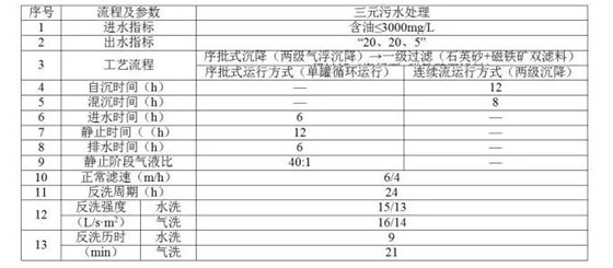 三采污水站分為普通聚驅(qū)污水站、高濃度聚驅(qū)污水站、三元污水站等,普通聚驅(qū)污水處理工藝流程與普通污水處理工藝流程相同,只是在過濾介質(zhì)、技術(shù)界限及工藝參數(shù)上做出調(diào)整。過濾介質(zhì)選擇適合含聚污水處理使用的石英砂、磁鐵礦等。當(dāng)含聚污水中聚合物濃度高于450mg/L時(shí),采用高濃度聚驅(qū)污水處理工藝,主要區(qū)別在于增加了沉降時(shí)間,過濾罐由石英砂改為石英砂磁鐵礦雙濾料過濾工藝。當(dāng)處理含表活劑、聚合物、堿的三元污水時(shí)采用“連續(xù)流氣浮、序批曝氣沉降、石英砂磁鐵礦、海綠石磁鐵礦過濾”處理工藝三元污水處理工藝。