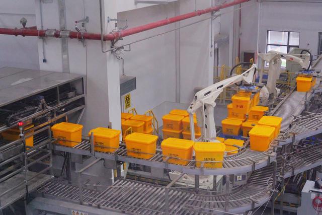當(dāng)一輛裝載著醫(yī)療廢物的運輸車進(jìn)入廠區(qū)后,車廂門一打開,負(fù)責(zé)卸貨的機械臂便迅速啟動,通過自身配備的攝像頭對周轉(zhuǎn)箱進(jìn)行拍照識別并完成自動抓取,裝有醫(yī)療廢物的黃色周轉(zhuǎn)箱隨即被放置于輸送線上。為了保證各個環(huán)節(jié)的無縫對接,園區(qū)特別定制了24000個固定尺寸的周轉(zhuǎn)箱,確保從收集、運輸?shù)教幚淼娜^程順利進(jìn)行。