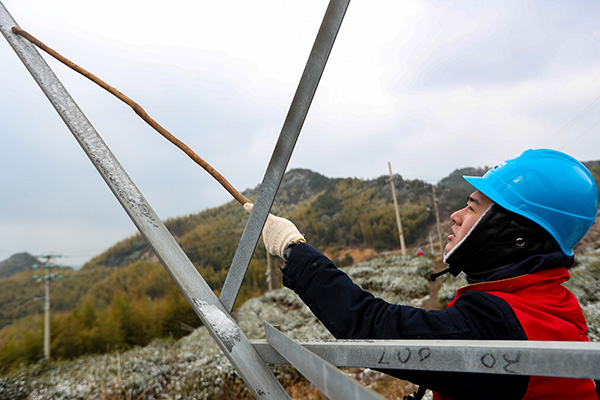 天空中時(shí)不時(shí)飄下來的小雪花染白了巡線員的鬢發(fā)、睫毛,甚至掉進(jìn)脖子里,凍得人直打哆嗦。連續(xù)幾個(gè)小時(shí)的工作,巡線員們的手被凍得通紅,只能搓搓手、哈哈氣。經(jīng)過幾個(gè)小時(shí)的努力,電力工人終于完成了這一條線路的巡視,消除了潛在的安全隱患。據(jù)了解,由于易覆冰區(qū)域均處在海拔720多米的高山上,上山、下山費(fèi)時(shí)費(fèi)力,因此寒潮期間,巡線人員每天起碼要走5個(gè)多小時(shí)的山路。