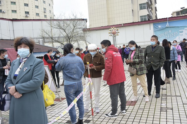 26日采樣當(dāng)天,該公司工作人員分為兩隊(duì),其中一隊(duì)40余人分為4組,在中興小區(qū)開(kāi)展“敲門(mén)行動(dòng)”,挨家挨戶(hù)上門(mén)登記核對(duì)人員名冊(cè),對(duì)于不會(huì)使用手機(jī)的人員則進(jìn)行一對(duì)一指導(dǎo),幫助他們快速進(jìn)行預(yù)約登記,并將不便出門(mén)人員一一登記造冊(cè),全面掃描、不漏盲區(qū)。另一隊(duì)20余人則留在采樣現(xiàn)場(chǎng),測(cè)溫、引導(dǎo)、信息登記、分發(fā)物資、環(huán)境消殺,各司其職,采樣現(xiàn)場(chǎng)秩序井然。對(duì)于不便出門(mén)的特殊人員,志愿者帶領(lǐng)醫(yī)護(hù)人員進(jìn)行上門(mén)采樣檢測(cè),確保責(zé)任小區(qū)471戶(hù)應(yīng)檢盡檢、不漏一戶(hù)、不漏一人。采樣結(jié)束后,志愿者還對(duì)采樣點(diǎn)全場(chǎng)地進(jìn)行消殺。
