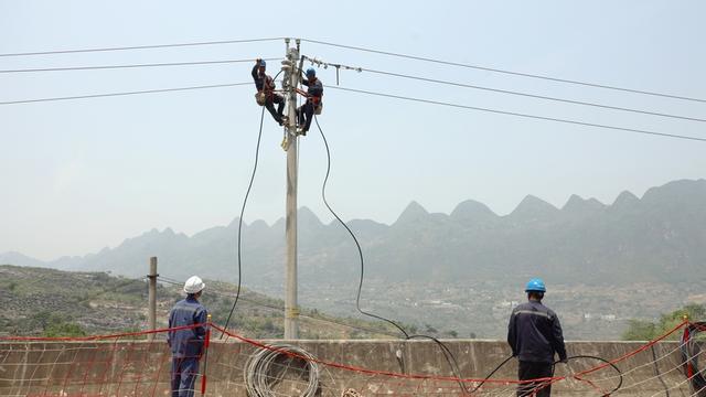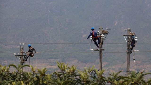 10千伏興頂線施工現(xiàn)場,兩名工作人員電桿作業(yè)。盧關(guān)文攝