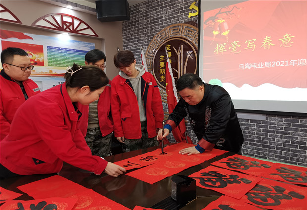 近日,由局工會(huì)和烏海市書法家協(xié)會(huì)聯(lián)合舉辦的“揮毫寫春意,潑墨送吉祥”活動(dòng)來(lái)到了基層單位六五四供電分局。活動(dòng)現(xiàn)場(chǎng),烏海市書法家協(xié)會(huì)榮譽(yù)主席宋永江揮毫潑墨,行云流水,落筆如云煙,書寫了既有喜迎牛年,辭舊迎新的美好愿景,也有大展宏圖的勵(lì)志語(yǔ)句。一幅幅精彩的書法作品,一句句吉祥如意的春聯(lián),不僅讓基層員工目睹了書法家的風(fēng)采,更為即將來(lái)臨的春節(jié)增添了濃濃的節(jié)日氣息。