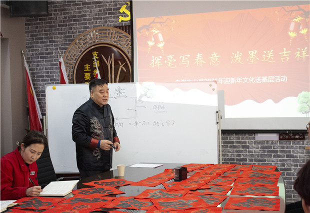 活動(dòng)中不僅觀看了書法大家揮灑自如、展示書法魅力的書寫,還激發(fā)了職工學(xué)習(xí)書法的熱情。宋主席隨即在現(xiàn)場(chǎng)進(jìn)行了書法授課,宋主席用四句話講述了書法要點(diǎn):分割均勻、舉一反三、學(xué)會(huì)分析、穿插移正。精準(zhǔn)的教授,讓現(xiàn)場(chǎng)的青工們躍躍欲試,紛紛拿起手中的毛筆開(kāi)始練了起來(lái)。青工程斌斌說(shuō):“宋主席的授課讓我找出了自己在書法中可以進(jìn)步的地方,平常忙于工作,每次想學(xué)習(xí)一下書法都沒(méi)有時(shí)間,這次這個(gè)機(jī)會(huì)太好了!”新入職員工也表示宋主席的書法飄若浮云,矯若驚龍,字里行間流露出對(duì)分局員工真切的祝福,讓我們心里暖暖的。聲聲問(wèn)候,情暖人心,送春聯(lián)的同時(shí)也將溫暖送到了分局員工的心里,為即將到來(lái)的春節(jié)增添了濃濃的喜慶氛圍,分局職工接過(guò)寫滿祝福和美好祝愿的春聯(lián),喜悅之情溢于言表。