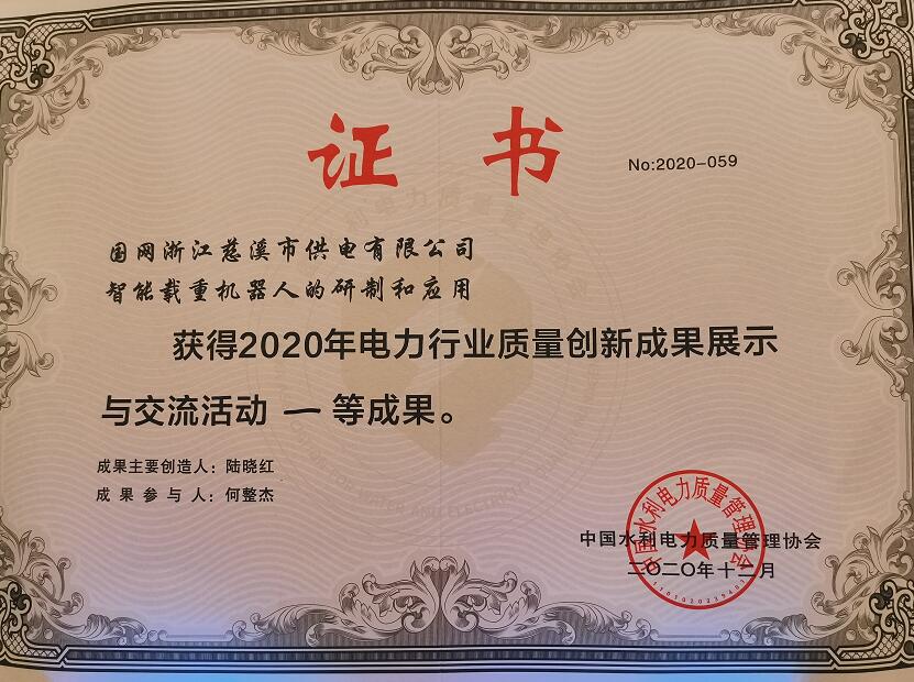 國網(wǎng)慈溪市供電公司智能機器人榮獲全國電力行業(yè)質量創(chuàng)新成果一等獎