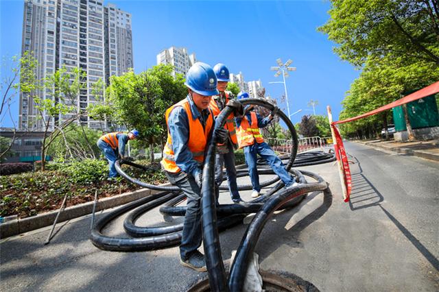 國網(wǎng)江西新余供電公司員工在城北仰天大道配電網(wǎng)改造工程現(xiàn)場敷設(shè)電纜。
