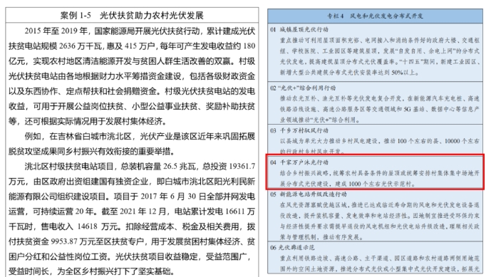 1、長期來看,鄉(xiāng)村振興是戶用光伏發(fā)展最大的機遇,分布式光伏將在農(nóng)村的能源轉(zhuǎn)型中發(fā)揮重要作用!1)國家能源局“戶用光伏+鄉(xiāng)村振興”規(guī)劃2022年6月,國家發(fā)改委、國家能源局、財政部等九部委聯(lián)合下發(fā)《“十四五”可再生能源發(fā)展規(guī)劃》,特別提出:千家萬戶沐光行動!結(jié)合鄉(xiāng)村振興戰(zhàn)略,統(tǒng)籌農(nóng)村具備條件的屋頂或統(tǒng)籌安排村集體集中場地開展分布式光伏建設(shè),建成1000個左右光伏示范村。