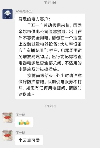 中國電力網(wǎng)訊 “‘五一’勞動節(jié)假期來臨,國網(wǎng)余姚市供電公司溫馨提醒:出門在外不忘安全用電。假期供電服務不打烊,如您有任何用電疑問,請隨時@我哦~”4月29日下午2點,余姚市陽光水岸小區(qū)微信群中收到這樣一條微信,受到小區(qū)群眾的一致好評。