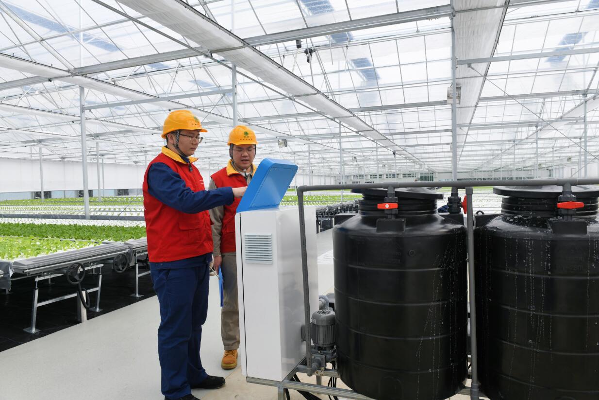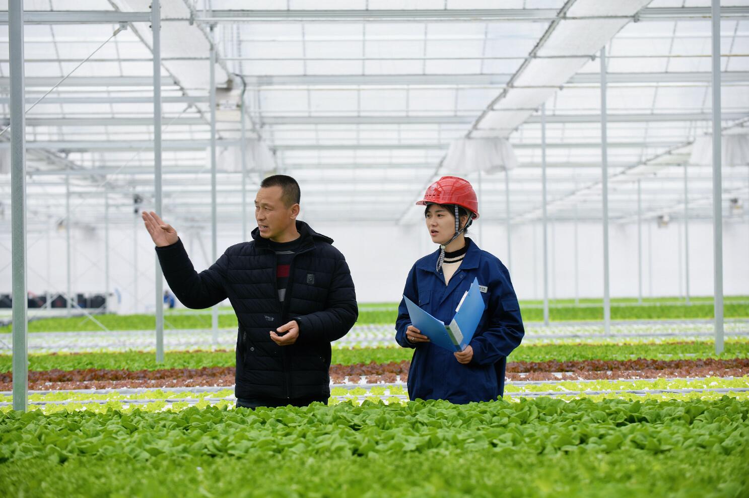 田野上的作物剛開始生長,各種現(xiàn)代化大棚里的蔬菜已經(jīng)煥發(fā)了盎然的生機。在橫坎頭村的蔚藍(lán)智谷植物工廠里,綠油油的菠菜、生菜、小松菜等蔬菜種在整齊的培養(yǎng)基上,一個個高大的溫室大棚連在一起,猶如工廠的車間,工作人員通過智能系統(tǒng)控制著溫度、濕度和營養(yǎng)液輸送。這樣的農(nóng)業(yè)種植模式打破了傳統(tǒng)的種植概念,將蔬菜種植“工廠化”,品質(zhì)和市場都得到了良好的保障。