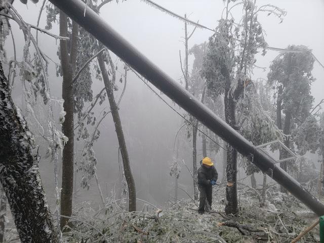 為確保景區(qū)供電需求和游客安全,該公司組織30余名黨員干部職工兵分三路,一邊緊急調(diào)集大功率發(fā)電機(jī)抬運(yùn)至景區(qū),第一時(shí)間保障該線(xiàn)路用戶(hù)可靠供電,一邊協(xié)同云陽(yáng)國(guó)家森林管理局、茶陵縣消防救援大隊(duì)緊急開(kāi)展道路疏通搶險(xiǎn),一邊穿冰簾掃障礙,為搶修斷桿線(xiàn)路做準(zhǔn)備。到處是冰碴斷枝的山林里,不斷有晶瑩剔透的冰塊從樹(shù)上掉落,搶修人員一邊用柴刀對(duì)樹(shù)枝進(jìn)行清理,一邊爬冰臥雪艱難前行,清理道路,運(yùn)送桿線(xiàn)搶修物資,在零下冰凍的高山上,分秒必爭(zhēng)地投入到搶修中。