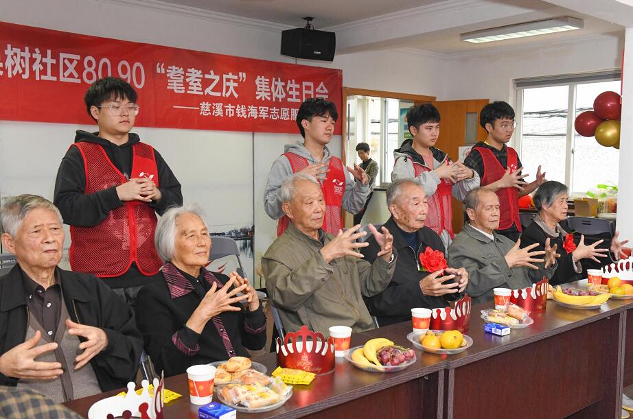 這是慈溪市白果樹社區(qū)第四屆“8090”耄耋老人集體生日會(huì)的現(xiàn)場(chǎng)。在重陽(yáng)節(jié)來(lái)臨之際,浙江慈溪市錢海軍志愿服務(wù)中心攜同白果樹社區(qū)和寧波大學(xué)科學(xué)技術(shù)學(xué)院,為社區(qū)內(nèi)30余名80歲以上老人們準(zhǔn)備了蛋糕、壽面和精彩的節(jié)目表演,提前給老人們過(guò)一個(gè)集體生日。