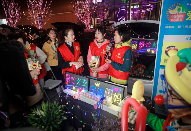 “我們下午15時(shí)就到廣場(chǎng)開始布置了。”張亞芬說,當(dāng)天下午她帶著丈夫、女兒和公司10多位志愿者早早地在寒風(fēng)里做起了義賣前準(zhǔn)備工作。雞蛋、鮮花、智能感應(yīng)燈,所有的義賣商品擺放得齊齊整整。晚上18時(shí),隨著音樂的響起,公益義賣正式開始,過往的行人來到“寧波媽媽”公益攤位前選購(gòu)起來。