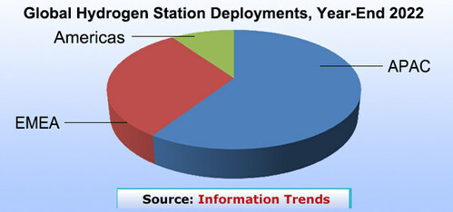 Information Trends名為《2023年全球加氫站市場(chǎng)》的研究表明,目前全球范圍內(nèi)以中國(guó)為首的加氫站部署勢(shì)頭強(qiáng)勁。美國(guó)則遠(yuǎn)遠(yuǎn)落后,但世界其他國(guó)家/地區(qū)正在迅速推動(dòng)氫能發(fā)展以滿足其能源需求。
