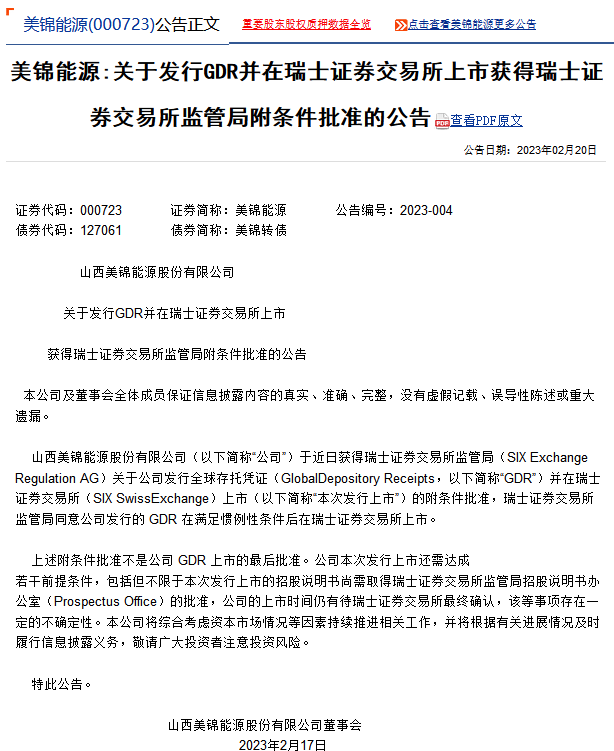 2月20日,美錦能源發(fā)布公告稱:公司于近日獲得瑞士證券交易所監(jiān)管局關于公司發(fā)行全球存托憑證(GDR)并在瑞士證券交易所上市的附條件批準,瑞士證券交易所監(jiān)管局同意公司發(fā)行的GDR在滿足慣例性條件后在瑞士證券交易所上市。