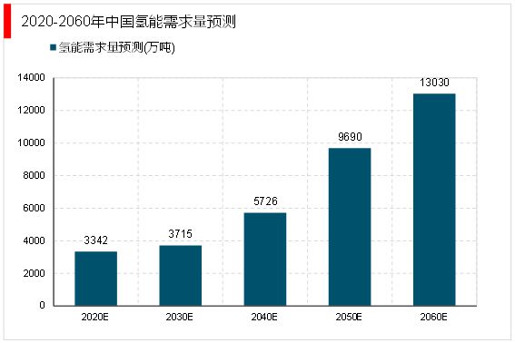 2020年,我國氫氣需求量約3342萬噸,在2030年碳達峰情景下,我國氫氣的年需求量將提高到3715萬噸,在終端能源消費中占比約5%;到2060年我國氫氣的年需求量將增至約13030萬噸,在終端能源消費中占比約20%。
