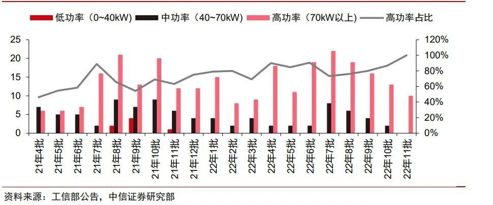 工信部推薦車型高功率化趨勢明顯,這與燃料電池快速的產(chǎn)品迭代與使用需求相關(guān),當(dāng)下主要的應(yīng)用場景是長途客運、干線物流、礦山、港口等場景,主流的燃料電池廠商都在不斷推高新產(chǎn)品的功率,打造燃料電池汽車大功率的優(yōu)勢以滿足下游應(yīng)用場景的需求,在鋼鐵廠、礦山等短途倒轉(zhuǎn)場景下,120~130kW的系統(tǒng)即可滿足類似需求,但是長途重載、干線物流由于路況和地形條件更為復(fù)雜,則需要系統(tǒng)功率提升至250~300kW。