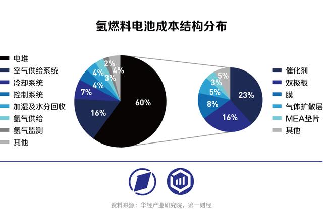 和鋰電、光伏產(chǎn)業(yè)相似,燃料電池走向大規(guī)模市場(chǎng)化的主要路徑是降低成本。根據(jù)華經(jīng)產(chǎn)業(yè)研究院數(shù)據(jù),氫燃料電池成本構(gòu)成中,電堆是最大構(gòu)成部分,占比約60%;在電堆成本構(gòu)成中,催化劑、雙極板和交換膜是主要成本來(lái)源,占總?cè)剂想姵爻杀颈壤謩e為23%、16%和8%。