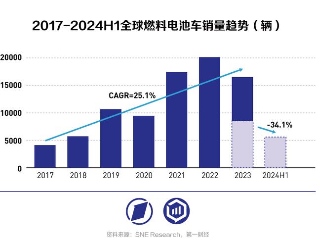 氫燃料電池車作為現(xiàn)階段燃料電池系統(tǒng)的主要應(yīng)用領(lǐng)域,二者表現(xiàn)高度相關(guān)。全球氫燃料電池車在2023年和2024年上半年銷量均出現(xiàn)收縮趨勢(shì)。根據(jù)SNE Research的數(shù)據(jù),2022年氫燃料電池車全球銷售20704輛,創(chuàng)歷史新高,此后開(kāi)始走低;2023年降至16413輛,同比下滑20.7%;2024年上半年該數(shù)字為5621輛,同比下滑34.1%。