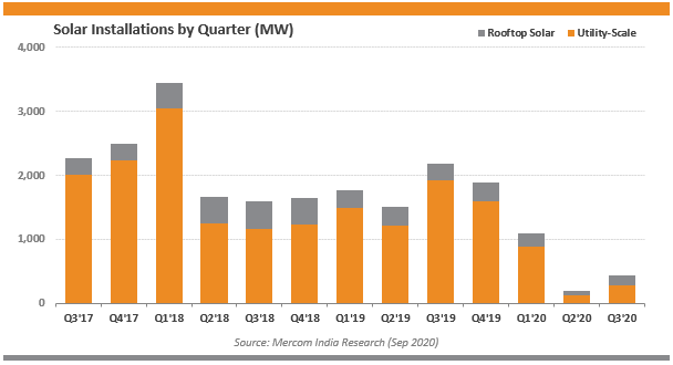 隨著疫情導(dǎo)致的全國(guó)范圍封鎖開(kāi)始逐漸放寬,印度經(jīng)濟(jì)也開(kāi)始緩慢復(fù)蘇。太陽(yáng)能行業(yè)也因此受到積極的影響,三季度裝機(jī)容量明顯好于上一季度。但是,該行業(yè)仍然有很長(zhǎng)的路要走,四季度的部分項(xiàng)目調(diào)試日期已被批準(zhǔn)延期至2021年上半年。