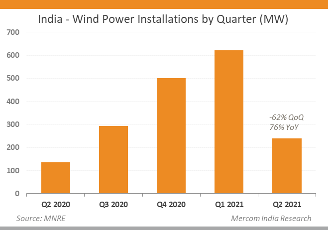 2021年第二季度,印度新增風(fēng)電裝機(jī)容量239兆瓦,環(huán)比下降62%,一季度新增623兆瓦。與2020年第二季度的136 MW相比,同比增長(zhǎng)了76%。