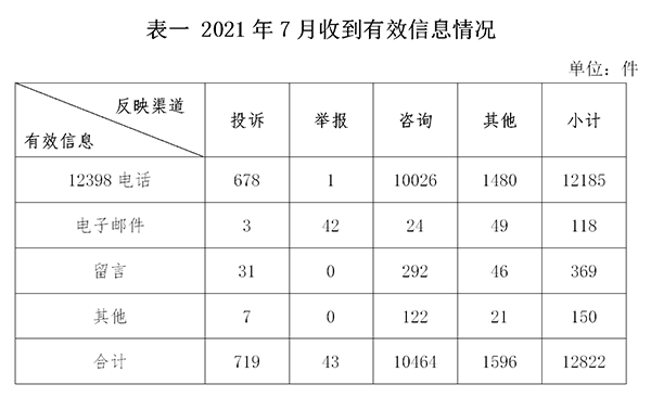 2021年7月,國家能源局12398能源監(jiān)管熱線(以下簡稱12398熱線)共收到有效信息12822件(包含投訴、舉報、咨詢和其他訴求類別),環(huán)比增加29.52%,同比增加11.58%。(2021年7月收到有效信息情況見表一)