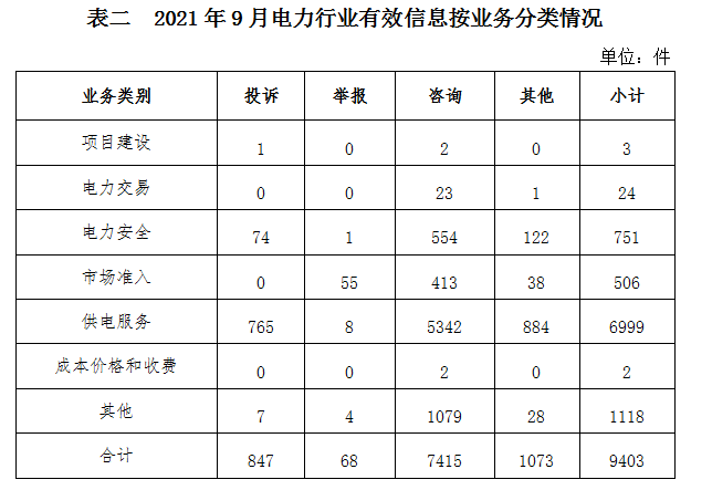 電力行業(yè)排在首位,有效信息數(shù)量為9403件,占全部有效信息的76.49%。群眾關(guān)注的內(nèi)容主要集中在有序用電、故障停電、供電安全等方面。(2021年9月電力行業(yè)有效信息按業(yè)務(wù)分類情況見(jiàn)表二)