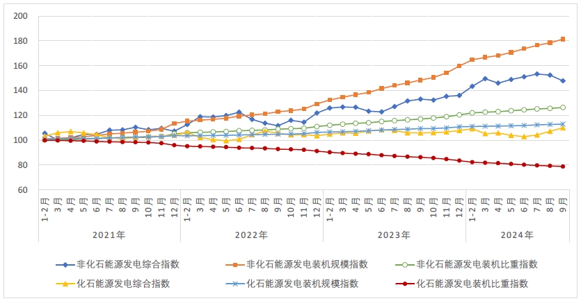 9月,非化石能源發(fā)電裝機(jī)規(guī)模指數(shù)為181.4,“十四五”以來非化石能源發(fā)電裝機(jī)規(guī)模累計增長了81.4%,同比增長22.2%。非化石能源發(fā)電裝機(jī)比重指數(shù)為126.3,“十四五”以來非化石能源發(fā)電裝機(jī)比重累計提升了26.3%(比重從2020年底的44.8%提高至2024年9月底的56.5%)。