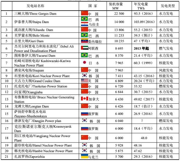 目前全球21席中,中國(guó)占有7席:水力發(fā)電占有4席:三峽大壩、溪洛渡大壩、向家壩和龍灘大壩;燃煤發(fā)電占一席:托克托電廠;核能發(fā)電占一席:陽(yáng)江核電站;風(fēng)電場(chǎng)占一席:酒泉風(fēng)電場(chǎng)。