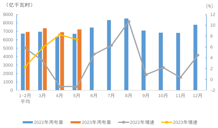 圖1 2022、2023年分月全社會(huì)用電量及其增速