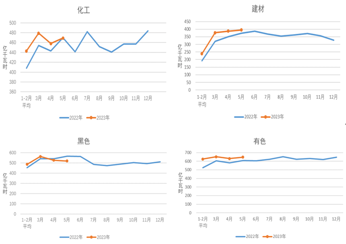 1-5月,化工行業(yè)用電量2297億千瓦時(shí),同比增長(zhǎng)3.2%;建材行業(yè)用電量1646億千瓦時(shí),同比增長(zhǎng)8.1%;黑色金屬冶煉行業(yè)用電量2580億千瓦時(shí),同比下降0.9%;有色金屬冶煉行業(yè)用電量3182億千瓦時(shí),同比增長(zhǎng)3.7%。