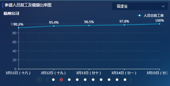 據(jù)了解,目前該應(yīng)用已上線了綜合展示、統(tǒng)計(jì)分析、項(xiàng)目管理、報(bào)表查詢4個(gè)重點(diǎn)功能。一是綜合展示,分別以地圖、熱圖、柱狀圖、曲線圖等不同方式,可直觀對比展示福建省各地區(qū)項(xiàng)目開復(fù)工生態(tài)指數(shù)及恢復(fù)趨勢等8個(gè)指標(biāo);二是統(tǒng)計(jì)分析,可展示出不同維度下各地區(qū)、各部人員復(fù)工率的恢復(fù)程度以及健康情況的統(tǒng)計(jì)視圖;三是項(xiàng)目管理,可查詢到全省各地市的具體項(xiàng)目復(fù)工復(fù)產(chǎn)情況,進(jìn)而實(shí)現(xiàn)對每個(gè)項(xiàng)目部的精準(zhǔn)分析;四是報(bào)表查詢,內(nèi)含項(xiàng)目詳細(xì)信息、人員詳細(xì)信息、人員健康情況等詳細(xì)信息,便于及時(shí)掌握人員、項(xiàng)目動(dòng)態(tài)。