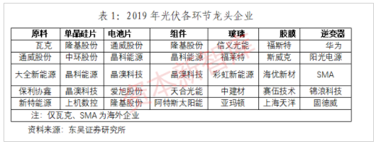 在組件環(huán)節(jié),2按產量排序,2019年前5大廠商分別為晶科能源、晶澳科技、天合光能、隆基股份、阿特斯太陽能。