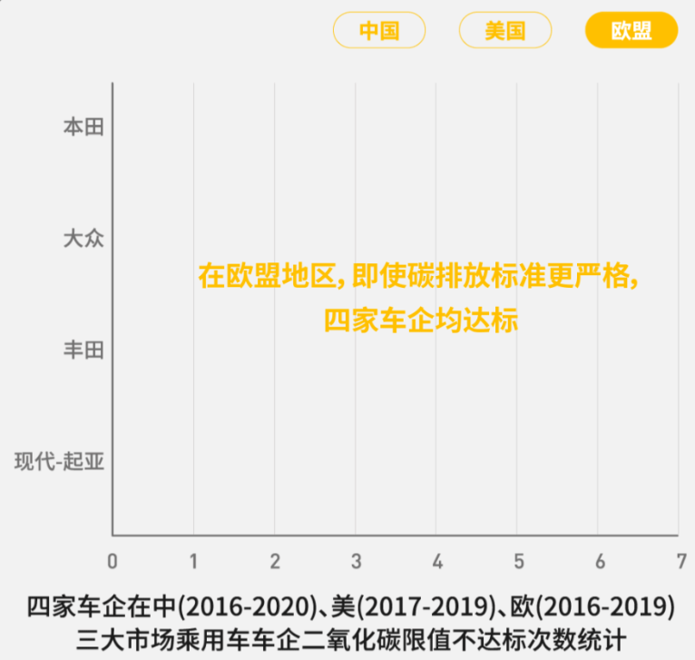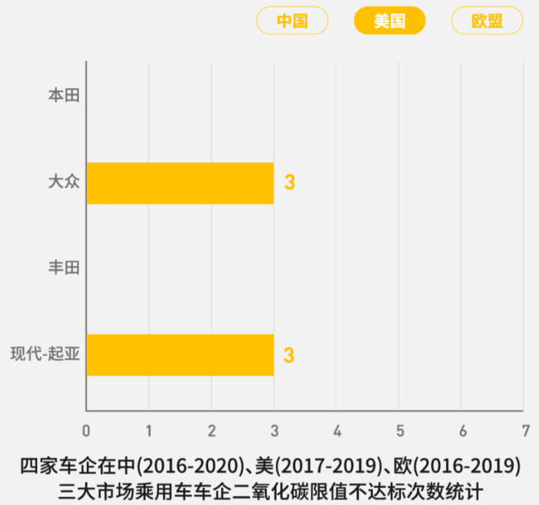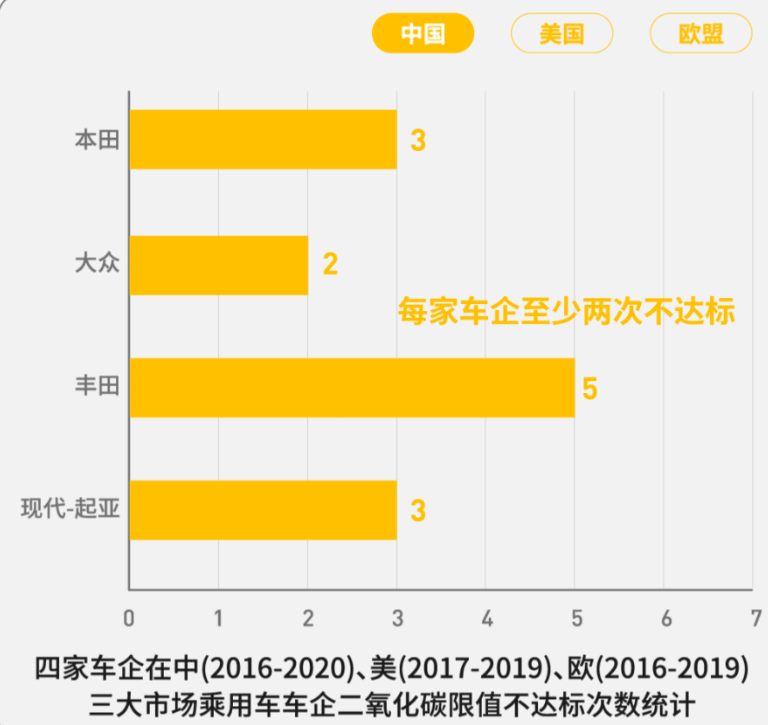 報(bào)告數(shù)據(jù)顯示,2016-2020年間,四家車(chē)企在中國(guó)均至少有兩次不達(dá)標(biāo),其中豐田五次不達(dá)標(biāo),本田與現(xiàn)代-起亞三次不達(dá)標(biāo),大眾則有兩次。