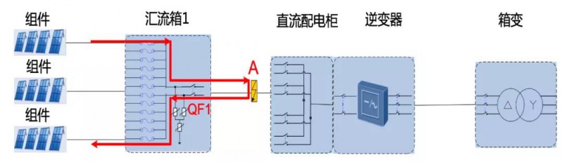 如上圖的A點發(fā)生短路故障,紅色故障回路:QF1為匯流箱斷路器,額定電流500A,由于組件的短路電流在480A左右,QF1一直不會脫扣,持續(xù)輸出直流能量到故障點,維持電弧燃燒,擴(kuò)大火災(zāi)事故。