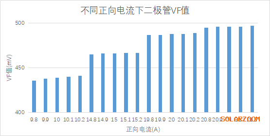 按照實(shí)測(cè)的兩個(gè)芯片VF值相差3mV來考量的話,將正向電流區(qū)間縮小再次測(cè)試,得到下圖數(shù)據(jù)??梢酝茰y(cè),如果雙芯片二極管兩個(gè)芯片間VF相差3mV,則2個(gè)芯片間分流相差不超過0.2A。實(shí)際上,在二極管結(jié)溫測(cè)試以及光伏組件戶外使用時(shí),0.2A的電流也是完全在誤差波動(dòng)范圍內(nèi)。