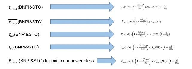 判定公式如圖2所示,其中m1 和 t1 分別為Pmax 的實驗室測試不確定度和生產(chǎn)商給出的功率公差上限的百分比。r則代表實驗室測試的可復(fù)性。