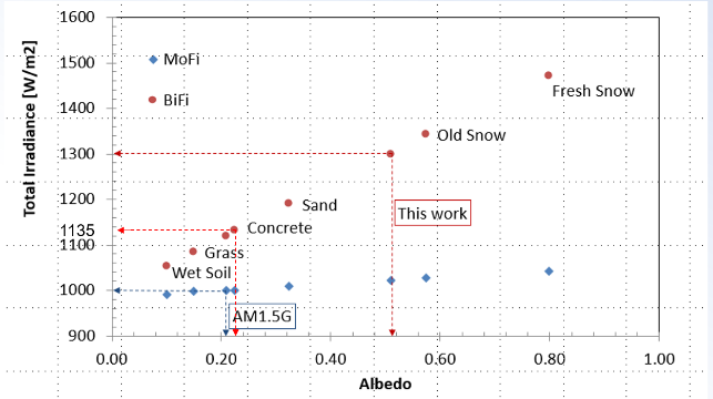 圖1中縱軸包括兩個關(guān)鍵點:1300w/m²和1135w/m²。135w/m²對應(yīng)于IEC 60904-3中定義的環(huán)境條件下雙面組件離地高度1米時背面所接受到的平均輻照度。基于此得到的雙面組件在BNPI條件下的測試結(jié)果不僅與傳統(tǒng)STC條件下的結(jié)果具有良好的兼容性,并且使在相同的條件下對雙面和單面組件的光伏性能進(jìn)行直接對比成為可能。除此外,BNPI條件下的性能測試結(jié)果也可以為組件選型和系統(tǒng)設(shè)計提供具有價值的參考信息。由于背面發(fā)電,雙面組件在戶外通常比單面組件產(chǎn)生更高的電流。較高的電流可能導(dǎo)致光伏組件局部溫度過高,特別是在發(fā)生電流聚集的區(qū)域。因此新版2021版 61215標(biāo)準(zhǔn)中的相關(guān)測試條件相應(yīng)進(jìn)行了修訂來反映出雙面組件在戶外高電流的情況。1300w/m²是綜合各種不同應(yīng)用場景下可能達(dá)到的背面輻照度的極端情況、實際應(yīng)用中這些場景的出現(xiàn)概率而確定的一個較為合理的強度,從圖1中也可以看出1300w/m²這個點已經(jīng)能覆蓋絕大部分的地表反射率,可以被認(rèn)為是一個合理的針對雙面組件可靠性驗證測試的背面輻照度。
