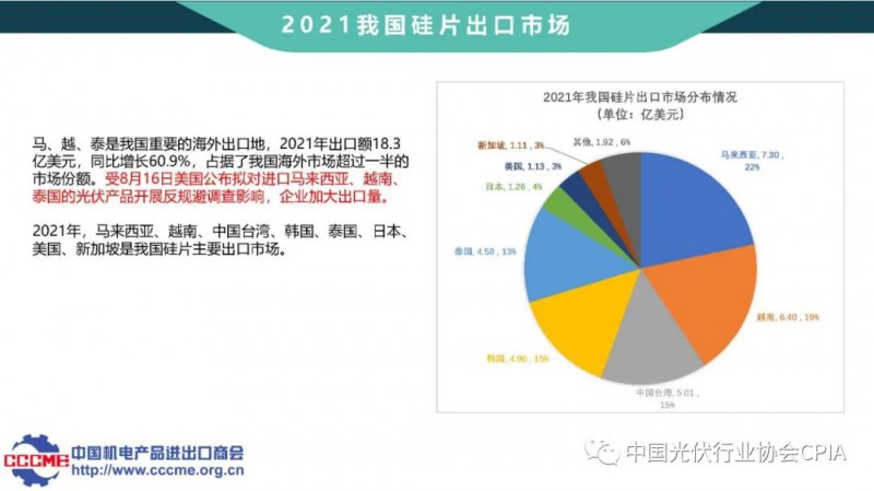 中國(guó)機(jī)電產(chǎn)品進(jìn)出口商會(huì)光伏分會(huì)秘書(shū)長(zhǎng)張森介紹光伏產(chǎn)品國(guó)際貿(mào)易情況。2021年我國(guó)光伏產(chǎn)業(yè)規(guī)模、對(duì)外貿(mào)易量持續(xù)擴(kuò)大,行業(yè)發(fā)展主要痛點(diǎn)是光伏貿(mào)易摩擦再次升級(jí)、海運(yùn)費(fèi)和匯率大幅上漲等。