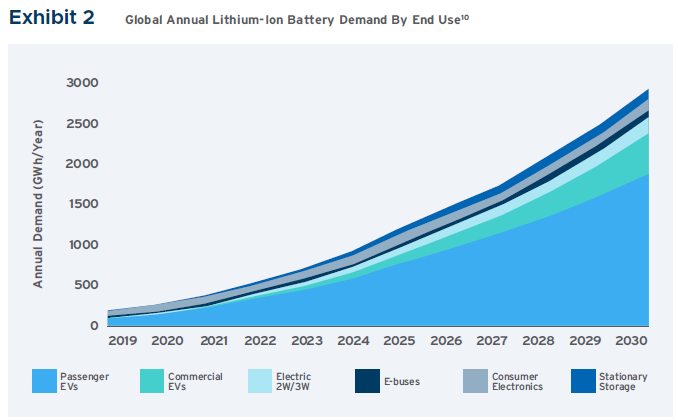 根據(jù)RMI公司的研究和彭博新能源財經(jīng)公司的分析,到2030年,全球?qū)︿囯x子電池的需求預計將達到每年2.8TW。其中大部分將滿足電動汽車需求。