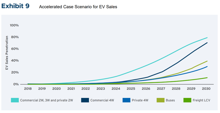 根據(jù)“加速情景”, 到2030年,電動汽車在新車銷售中的細分市場滲透率將達到私家車的30%、商用車的70%、公交車的40%以及兩輪和三輪車的80%。在“保守情景”中,預計2030年電動汽車在所有汽車細分市場的新銷量中的加權(quán)平均滲透率為35%。