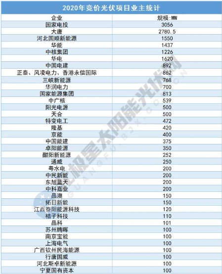 (2020年競價光伏項目規(guī)模超100MW業(yè)主)