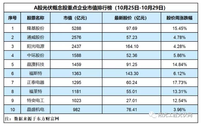 上周(10月25日-29日)光伏板塊再度爆發(fā),記者重點監(jiān)測的10家企業(yè)全線上漲,其中,正泰電器周度上漲17.73%,隆基股份上漲15.45%,晶澳科技漲了14.84%,福萊特上漲13.31%。晶澳科技、特變電工的最新市值分別為1459億元和1023億元,排名上升,成為排行榜第五、第九位。