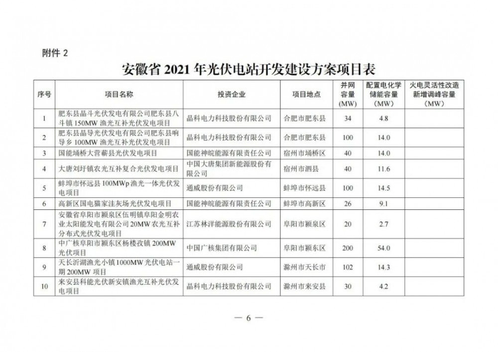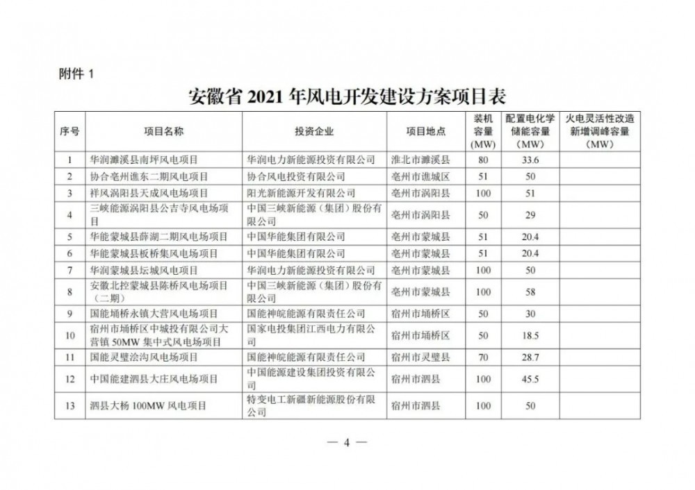 12月6日,安徽省能源局關(guān)于印發(fā)2021年風電、光伏發(fā)電開發(fā)建設(shè)方案的通知。其中,光伏并網(wǎng)容量4574MW,要求配置電化學儲能容量961.5 MW,火電靈活性改造新增調(diào)峰容量619.6MW。風電裝機容量1426MW,要求配置電化學儲能容量600.4 MW,火電靈活性改造新增調(diào)峰容量349.7MW。且規(guī)定電化學儲能電站連續(xù)儲能時長為1小時。
