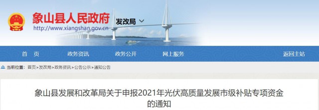 7月5日,浙江象山縣發(fā)展和改革局關(guān)于申報(bào)2021年光伏高質(zhì)量發(fā)展市級補(bǔ)貼專項(xiàng)資金的通知發(fā)布。