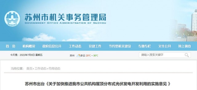 意見(jiàn)明確,到2025年底,蘇州市公共機(jī)構(gòu)新建建筑可安裝光伏屋頂面積實(shí)現(xiàn)光伏覆蓋率達(dá)到50%以上,全市公共機(jī)構(gòu)既有建筑屋頂建設(shè)光伏設(shè)施,安裝比例不低于可安裝光伏屋頂面積的50%。常熟市、吳江區(qū)、吳中區(qū)、相城區(qū)等四個(gè)全國(guó)整縣(市、區(qū))屋頂分布式光伏開(kāi)發(fā)試點(diǎn)地區(qū)公共機(jī)構(gòu)于2023年底前達(dá)成上述目標(biāo)