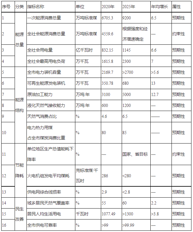 2.結構目標。到2025年,全市電力裝機容量達到2700萬千瓦以上,其中,可再生能源發(fā)電裝機容量達到680萬千瓦以上,清潔能源發(fā)電裝機占電力總裝機容量達到45%以上;原油加工能力達到5000萬噸/年,液化天然氣接收能力達到1200萬噸/年;全市能源消費結構進一步優(yōu)化,天然氣消費占比力爭達到6.5%;電力熱力用煤占全市煤炭消費比重達到85%以上。