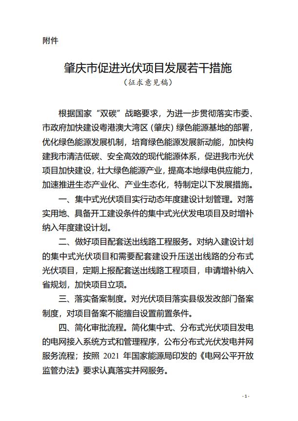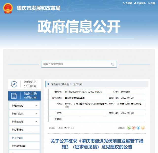 7月8日,廣東省肇慶市發(fā)改局發(fā)布關(guān)于公開征求《肇慶市促進(jìn)光伏項(xiàng)目發(fā)展若干措施》(征求意見稿)意見建議的公告。