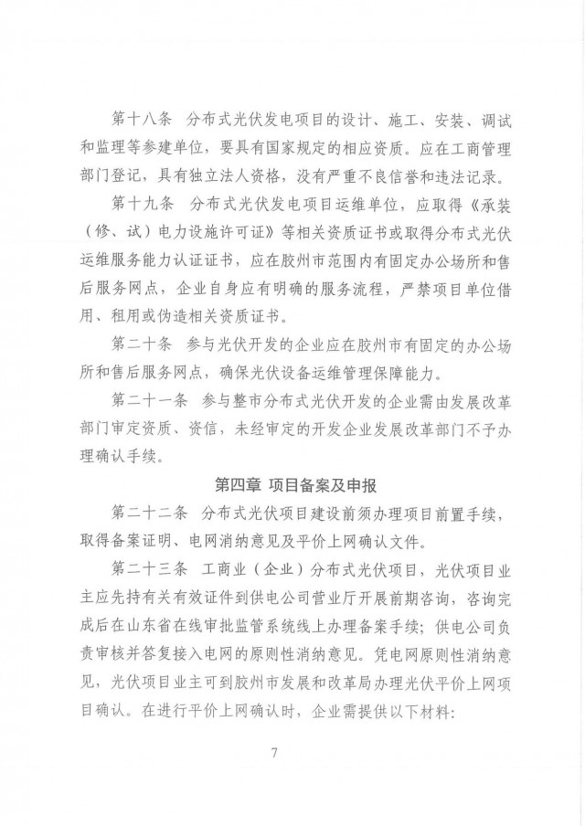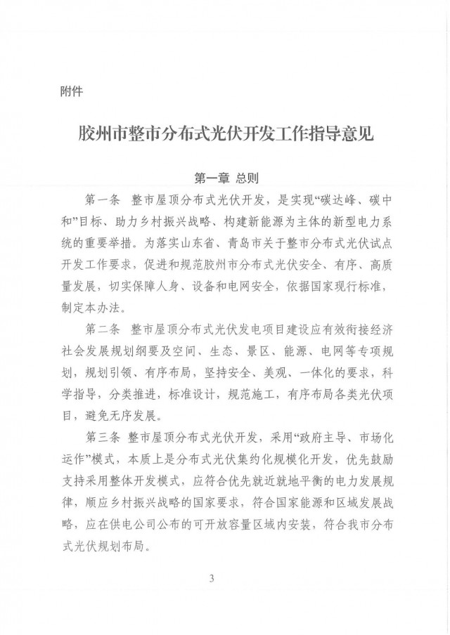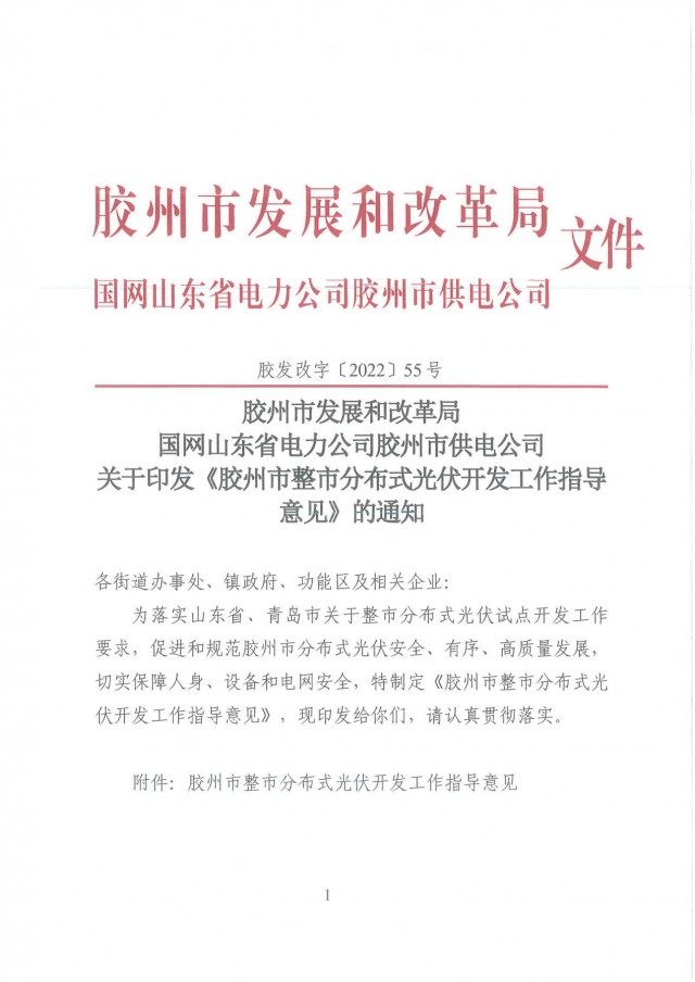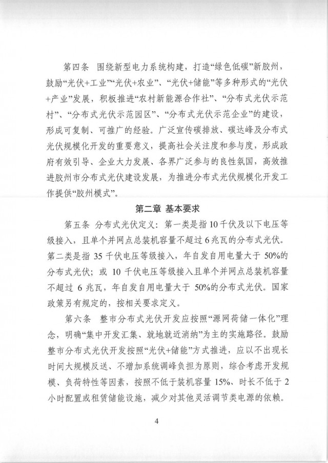 近日,山東膠州市發(fā)改委發(fā)布了《膠州市整市分布式光伏開發(fā)工作指導(dǎo)意見》。文件要求,整市分布式光伏開發(fā)應(yīng)按照“源網(wǎng)荷儲一體化”理念,明確“集中開發(fā)匯集、就地就近消納”為主的實施路徑。鼓勵整市分布式光伏開發(fā)按照“光伏+儲能”方式推進,應(yīng)以不出現(xiàn)長時間大規(guī)模反送、不增加系統(tǒng)調(diào)峰負擔(dān)為原則,綜合考慮開發(fā)規(guī)模、負荷特性等因素,按照不低于裝機容量15%、時長不低于2小時配置或租賃儲能設(shè)施,減少對其他靈活調(diào)節(jié)類電源的依賴。