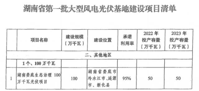 第一批風光大基地名單中的另一項目,湖南婁底生態(tài)治理100萬千瓦光伏項目,首批500MW將于2022年10月30日前并網(wǎng)。
